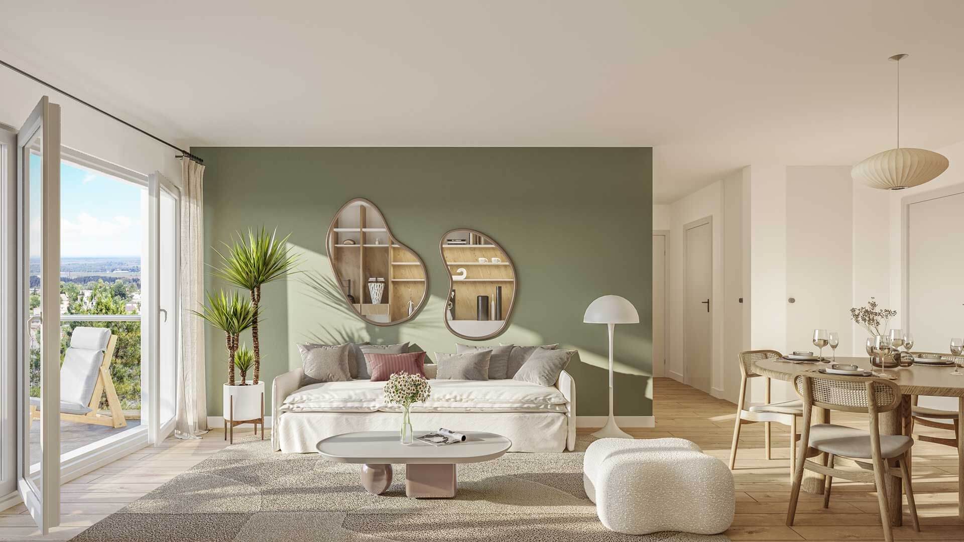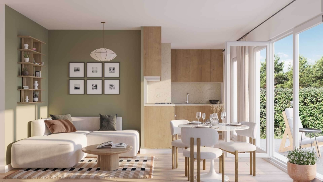 Les séjours spacieux et lumineux avec cuisine ouverte invitent à des moments de convivialité. De grandes ouvertures prolongent la pièce vers un balcon, une terrasse ou un jardin privatif.